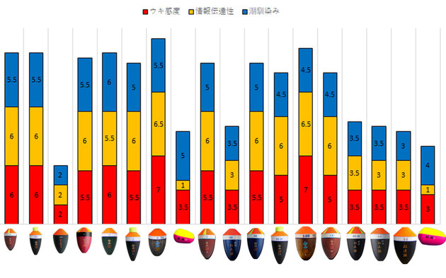 松田ウキ全種類をウキ感度・情報伝達性・なじみごとに順番に並べてみると、、、